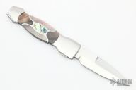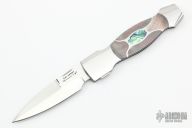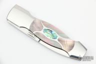 This Self Lock Interframe folding knife by Scott Sawby features a mirror polished blade with false top edge and a nail nick. The handle has a polished stainless steel frame with black lip pearl and abalone inlays. Nice lockup and blade seating. Excellent condition.