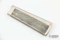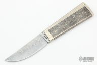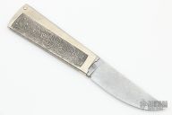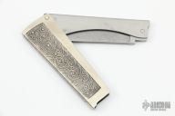 This knife by Master Smith Gary L Barnes features a Damascus blade. The handle is two-pieces that open and close. They are made of nickel silver and the outer one is engraved. Excellent condition.