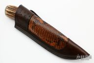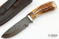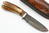 This Hunter by Herb Derr features a Bird's Eye Pattern Damascus blade with file worked spine. .167" blade depth and 1.282" blade depth, hidden tang construction. The handle is comprised of a nickel silver guard and pommel with maple burl and nickel silver spacer and a stag grip. Includes a brown leather sheath with boa skin inlay. Comes with COA. New from maker at the 2022 Blade Show.