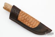 This Knife by Herb Derr features a Twist Pattern Damascus blade with file worked spine, .165" blade depth and 1.431" blade depth, hidden tang construction. The handle is comprised of a nickel silver guard and pommel with maple burl and nickel silver spacer and a sea cow rib bone grip. Includes a brown leather sheath with python skin inlay. Comes with COA. New from maker at the 2022 Blade Show.