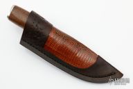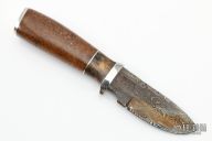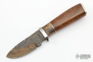 This Knife by Herb Derr features a Birds Eye Pattern Damascus blade with file worked spine, .165" blade depth and 1.113" blade depth, hidden tang construction. The handle is comprised of a nickel silver guard and pommel with buckeye burl and nickel silver spacer and a sea cow rib bone grip. Includes a brown leather sheath with lizzard skin inlay. Comes with COA. New from maker at the 2022 Blade Show.