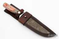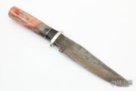 This Knife by Herb Derr features a Twist Pattern Damascus blade with file worked spine, .169" blade depth and 1.332" blade depth, hidden tang construction. The handle is comprised of a nickel silver guard and pommel with redwood burl and nickel silver spacer and a zebra leg bone grip. Includes a brown leather sheath with lizzard skin inlay. Comes with COA. New from maker at the 2022 Blade Show.
