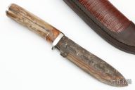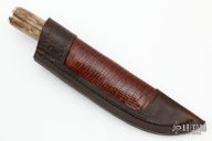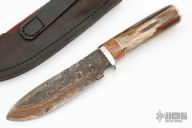 This Knife by Herb Derr features a Birds Eye Pattern Damascus blade with file worked spine, .169" blade depth and 1.388" blade depth, hidden tang construction. The handle is comprised of a nickel silver guard and pommel with buckeye burl and nickel silver spacer and a zebra leg bone grip. Includes a brown leather sheath with lizzard skin inlay. Comes with COA. New from maker at the 2022 Blade Show.