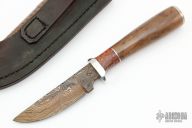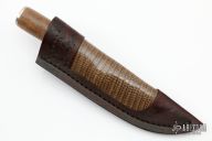 This Knife by Herb Derr features a Birds Eye Pattern Damascus blade with file worked spine, .159" blade depth and .889" blade depth, hidden tang construction. The handle is comprised of a nickel silver guard and pommel with box elder burl and nickel silver spacer and an oosic grip. Includes a brown leather sheath with lizzard skin inlay. Comes with COA. New from maker at the 2022 Blade Show.