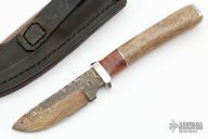 This Knife by Herb Derr features a Birds Eye Pattern Damascus blade with file worked spine, .163" blade depth and .914" blade depth, hidden tang construction. The handle is comprised of a nickel silver guard and pommel with box elder burl and nickel silver spacer and an oosic grip. Includes a brown leather sheath with lizzard skin inlay. Comes with COA. New from maker at the 2022 Blade Show.