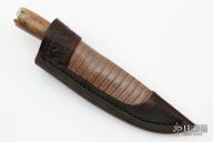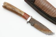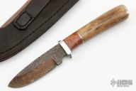 This Knife by Herb Derr features a Birds Eye Pattern Damascus blade with file worked spine, .161" blade depth and .964" blade depth, hidden tang construction. The handle is comprised of a nickel silver guard and pommel with box elder burl and nickel silver spacer and an oosic grip. Includes a brown leather sheath with lizzard skin inlay. Comes with COA. New from maker at the 2022 Blade Show.