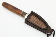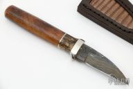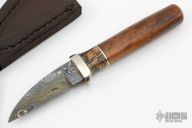 This Neck Knife by Herb Derr features a Birds Eye Pattern Damascus blade, .150" blade depth and .710" blade depth, hidden tang construction. The handle is comprised of a nickel silver guard with spalted oak and nickel silver spacer and an oosic grip. Includes a brown leather magnetic sheath with lizzard skin inlay. New from maker at the 2022 Blade Show.