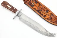 This Coffin Handle Bowie by ABS Apprentice Kevin Burgess features a hand rub satin finished blade with beautiful hamon, .250" blade stock and 1.948" blade depth, hidden/frame tang construction. The handle has satin finished stainless steel guard with mirror polished edges, stainless steel collar and frame, maple burl wood scales with stainless steel pins and Argentium Silver shields, coin edged brass liners/spacers. Comes with a beautiful hand tooled black/brown leather sheath. New from maker at the 2022 Blade Show.
