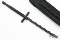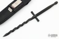 This Twisted Spanish Dagger from Crawford Knives is an all steel 440C sleeve knife. It is designed and refined after seeing the OSS sleeve dagger from World War II. The blade is twisted and triangle shaped for strength and easy penetration. The handle is knurled for a sure grip and has posts for a guard. Tungsten DLC coated. Includes a leather sheath with metal clip. New from maker at the 2022 Blade Show.
