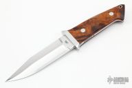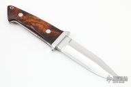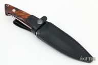 This Loveless Design Lawndale Fighter by Marco Panella features a mirror polished blade with sharpened top edge, .201" blade stock and 1.208" blade depth, full tapered tang construction. The handle has a 416 SS guard, ironwood scales with red liners, stainless steel pins and lanyard hold. Has checkered thumb and finger rests on the tang. Comes with a black leather sheath. New from maker at the 2022 Blade Show. Comes with a custom zippered case.