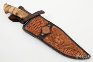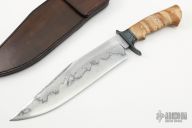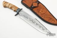 This Bowie by Gregory Picard features a hand rub satin finished blade with false top edge and beautiful hamon, .278" blade stock and 2.225" blade depth, hidden/frame tang construction. The handle has a fluted and blued steel guard, blued steel tapered frame, poplar scales with nickel silver spacer and pins. Comes with a hand tooled black/brown leather sheath by Michael Spanjers. Comes with a zippered case. Excellent condition. Really attractive bowie!
