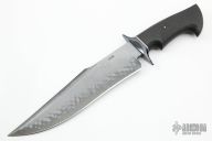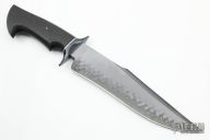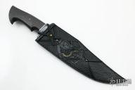 This Fighter by the Sobral Brothers features a San Mai Damascus blade with false top edge, .235" blade stock and 2.160" blade depth, hidden tang construction. The guard is blued steel with a nicely figured carbon fiber grip, orange peel finished titanium spacer. Comes with a hand tooled black leather sheath and a leather zippered case. Excellent condition.