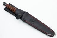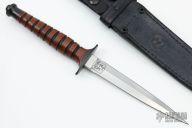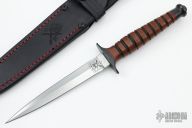 This Commando Classic Dagger by Vehement Knives features a hand rub satin finished double edged blade with .182" blade stock and .866" blade depth, hidden tang construction. The handle has a blackened brass guard, blackened aluminum pommel, and black/brown grooved stacked leather grip with red/black spacers. Comes with a black leather sheath, original box and papers. Excellent condition. #018