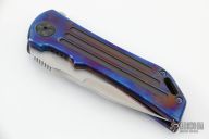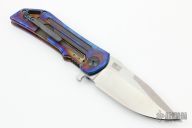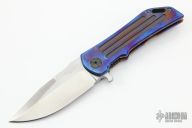 This Dominator Level 2 V4 by Darrel Ralph features a satin finished blade with notched thumbrest and flipper. The handle has a blue anodized titanium frame with a zirconium pivot, tip up clip and backspacer. Rides on bearings, nice detent, lockup and blade seating. Comes with a zippered case and COA. Excellent condition.