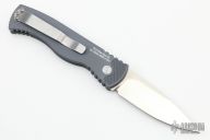 This Limited Edition TR-2.63 by Pro-Tech Knives has a satin finish blade and a gray aluminum handle inlaid with a sterling silver skull designed by Bruce Shaw. Satin stainless steel clip. Serial number 298 of 500 made. Comes with original box, sheath and papers. Excellent condition.