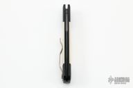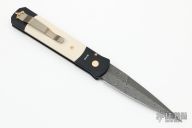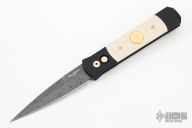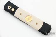This Godfather Tuxedo by Protech features Chad Nichols Damascus blade and a black aluminum handle with ivory paper micarta scales and a 1/10 oz solid gold American Eagle coin inlay. Gold plate hardware and push button, gold anodized titanium clip, tip up carry. The handle is marked with #5 of 20 of this limited edition. Comes with original box. Excellent condition.