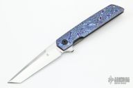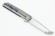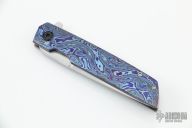 This Model 35 Flipper by Jason Clark features a tanto blade with a notched flipper. The handle has a black timascus and bead blasted titanium frame, floating stainless steel backspacer, matching tip up clip. Rides on IKBS, nice detent, lockup and blade seating. Comes with a leather slip sheath and COA. Excellent condition.