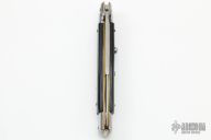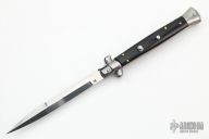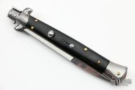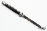 This 11" Swivel Bolster Auto by Frank Beltrame features a polished dagger ground blade with false top edge. The handle has stainless steel bolsters, front and rear, Buffalo Horn scales, brass liners, stainless spring. Excellent condition.