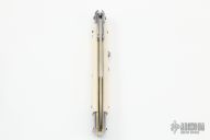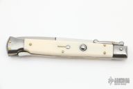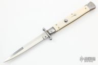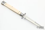 This 11" Swing Guard Auto by Frank Beltrame features a polished dagger/bayonet ground blade with false top edge. The handle has stainless steel bolsters, front and rear, imitation ivory scales, brass liners, stainless spring. Excellent Condition.