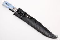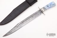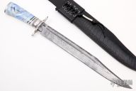 This Fighting Bowie by Journeyman Smith Stuart Smith features a Damascus blade (75Ni8/1070), nearly sharpened top edge, fullers, .292" blade stock and 1.527" blade depth, hidden tang construction. The handle has a stainless steel guard and butt, stabilized cross-cut mammoth ivory grip, fluted stainless steel spacer with bead blasted stainless steel spacers on either side. Comes with a black leather sheath with ostrich leg skin overlay, has a cowhide corset style frog. Comes with COA dated 4/4/2021. Excellent condition.
