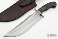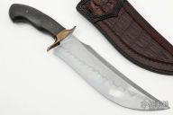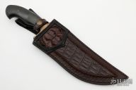 This Bowie by Songrit Mawan features a hand rub satin finished blade with nice hamon and false top edge, .298" blade stock and 2.317" blade depth, hidden tang construction. The handle has a bronze guard, carbon fiber grip and copper spacer and pens. Comes with a hand tooled brown/black leather sheath with alligator skin inlays. Excellent condition.