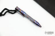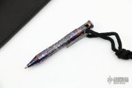 Anodized Titanium Bolt Action Style Pen by Max Knives. The clip is the bolt, push it down and over to deploy the pen. Comes with a black leather slip sheath. New from maker at the 2022 Blade Show.