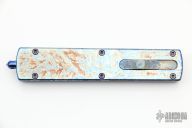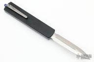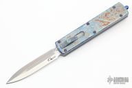 This G12 OTF Auto by Golgoth Knives features a satin finished double edged blade with fullers. The handle has a black aluminum chassis with anodized titanium top, anodized titanium hardware, tip down titanium clip. Comes with velcro case. New from maker at the 2022 Blade Show. #1673