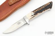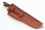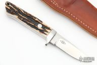 This knife by Bob Dozier features a hand ground satin finished blade, .189" blade stock and .829" blade depth, full tapered tang construction. This knife was hand ground and made solely by Bob Dozier. The handle has a stainless steel guard, stag scales with red liners. Has lanyard hole at the butt. Comes with a brown leather sheath. New from maker at the 2022 Blade Show.