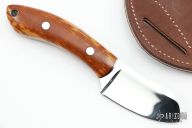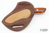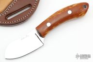 This knife by Eddie Ray features a mirror polished blade with .085" blade stock and 1.181" blade depth, full tang construction. The handle has vintage Westinghouse paper micarta scales with blue liners and stainless steel pins. Comes with a brown leather cross draw sheath with deer skin inlay. New from maker at the 2022 Blade Show.