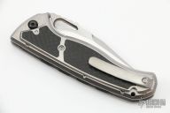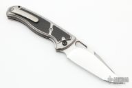 This Revolution Bolster release D/A from Matt Diskin features a mirror finished tanto blade with thumbhole and checkered thumbrest. The handle has a satin and orange peel finished titanium frame, satin finished titanium bolsters and scales both with carbon fiber inlays, tip up orange peel finished titanium clip, and a notched carbon fiber backspacer, stainless steel liner, titanium screws. Nice detent, lockup, action and blade seating. Includes a leather case. New from maker at the 2022 Blade Show.