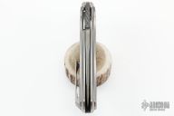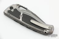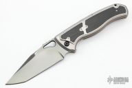 This Revolution Bolster release D/A from Matt Diskin features a DLC mirror finished tanto blade with thumbhole and checkered thumbrest. The handle has a satin and orange peel finished titanium frame, satin finished titanium bolsters and scales both with carbon fiber inlays, tip up orange peel finished titanium clip, and a notched carbon fiber backspacer, stainless steel liner, titanium screws. Nice detent, lockup, action and blade seating. Includes a leather case. New from maker at the 2022 Blade Show.