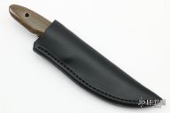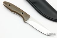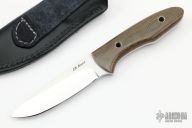 This knife by Kay Brend features a satin finished blade with .165" blade stock and .970" blade depth, full tang construction with green canvas micarta scales. Comes with a black leather sheath. New from maker at the 2022 Blade Show.