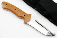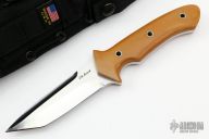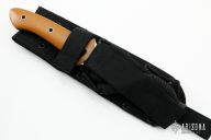 This knife by Kay Brend features a satin finished blade with a false top edge, .210" blade stock and 1.175" blade depth, full tang construction with vintage linen micarta scales. Comes with a black Spec-Ops Brand sheath. New from maker at the 2022 Blade Show.