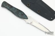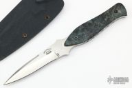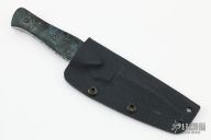 This Stinger by Bud Nealy features a hand rub satin finished blade with notched thumb and index finger rests and false top edge, .152" blade stock and .830" blade depth, full tang construction. The handle has dyed maple burl wood scales and a fileworked tang. Comes with kydex sheath. #7375. Has a couple light scratches and a chip/crack at the base. Great condition otherwise.