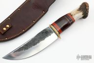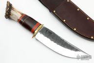 This Scagel Camp Knife by Rocco Handmade features a satin finished hollow ground blade with hammer marked flats, .249" blade stock and 2.017" blade depth, hidden tang construction. The handle features a brass guard, black/brass/red/stacked leather/aluminum spacer pattern, and a crown stag butt with brass pin. Great look and feel. Comes with brown leather sheath. New from maker at the 2022 Blade Show.