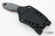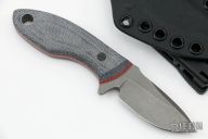 This Hydra by Tom Krein features an acid washed blade with .122" blade stock and .980" blade depth, full tang construction. The handle has blue canvas micarta scales with red liners and black pin with lanyard hole. Includes a kydex belt sheath with TekLok. New from maker at the 2022 Blade Show.