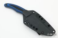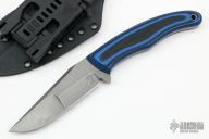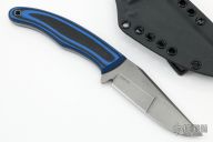 This Vagabond by Tom Krein features an acid washed compound gound blade with .173" blade stock and 1.232" blade depth, full tang construction. The handle has blue/black G-10 scales with aluminum lanyard tube and black pin. Includes Kydex sheath with TekLok. New from maker at the 2022 Blade Show.