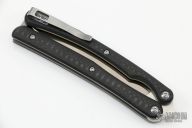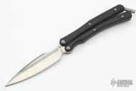 This BaliTac by Max Knives is a Grind Tactical Deisgn. It features a satin finished blade with fullers. The handles have Black G-10 scales, bead blasted titanium liners and T-latch, tip up stainless steel clip. Comes with velcro case and COA #145/150. New from maker at the 2022 Blade Show Texas.