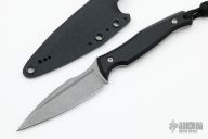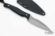 This Sosback by Grind Tactical Knives features an acid stonewashed blade with fullers and a notched thumbrest, .119" blade stock and .885" blade depth, full tang construction with black G-10 scales. Comes with a kydex sheath, COA and original box. New from maker at the 2022 Blade Show.