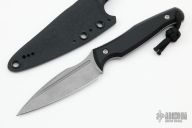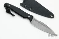 This Sosback by Grind Tactical Knives features an acid stonewashed blade with fullers and a notched thumbrest, .119" blade stock and .885" blade depth, full tang construction with black G-10 scales. Comes with a kydex sheath, COA and original box. New from maker at the 2022 Blade Show.
