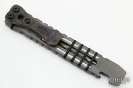 This prybar by Tim Miller is made from 6AL4V Titanium, it is .275" thick, has rubber o-rings holding in a phillips/flathead bit and a 1/4" hex driver for the bit, bottle opener, has lanyard holes and a titanium clip. Comes with COA. New from maker at the 2022 Blade Show.