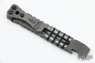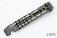 This prybar by Tim Miller is made from 6AL4V Titanium, it is .275" thick, has rubber o-rings holding in a phillips/flathead bit and a 1/4" hex driver for the bit, bottle opener, has lanyard holes and a titanium clip. Comes with COA. New from maker at the 2022 Blade Show.