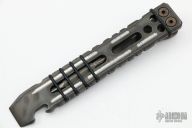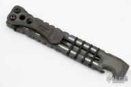 This prybar by Tim Miller is made from 6AL4V Titanium, it is .275" thick, has rubber o-rings holding in a phillips/flathead bit and a 1/4" hex driver for the bit, bottle opener, has lanyard holes and a titanium clip. Comes with COA. New from maker at the 2022 Blade Show.