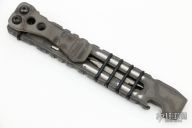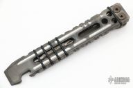 This prybar by Tim Miller is made from 6AL4V Titanium, it is .275" thick, has rubber o-rings holding in a phillips/flathead bit and a 1/4" hex driver for the bit, bottle opener, has lanyard holes and a titanium clip. Comes with COA. New from maker at the 2022 Blade Show.
