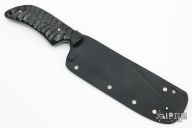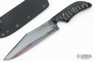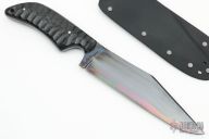 This Military Bowie by Fred Perrin features a black clip point blade with swedge and notched thumbrest, visible temper line, .147" blade stock and 1.604" blade depth, full tang construction. The handle is comprised of contoured black linen micarta scales with nickel silver pins and lanyard hole. Includes kydex sheath. New from maker at the 2022 Blade Show.