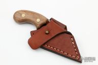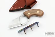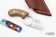 This La Griffe Shark features a scandi ground blade with a razor sharp edge, and wood scales, full tang construction, .125" blade thickness and 1.175" blade depth. Perfect fit in the hand. Includes a brown leather belt sheath. Comes an anodized titanium shoe spike that can be tied into the laces of your shoe. New from maker!