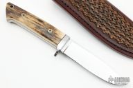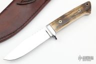 This Clip Point Hunter by George Trout features a mirror polished blade with a fileworked spine, .153" blade stock and 1.013" blade depth, full tapered tang construction. The handle has a stainless steel guard, mammoth ivory scales with black liners, mosaic pins and a lanyard hole at the butt. Comes with a hand tooled brown leather sheath. New from maker at the 2022 Blade Show.