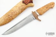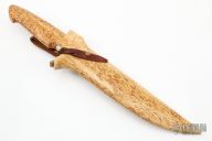 This Long Knife by carlMichael features a Michael Andersson Damascus blade with a false top edge, .138" blade stock and 1.525" blade depth, hidden tang construction. The handle has a mammoth ivory guard, spalted curly maple burl grip and a reindeer antler spacer. Comes with a matching wooden sheath. New from maker at the 2022 Blade Show.