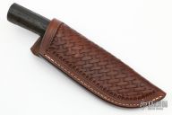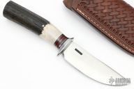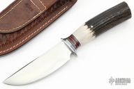 This Hunter by Mike Malosh features a satin finished convex ground blade with .166" blade stock and 1.255" blade depth, hidden tang construction. The handle has a stainless steel guard, stag grip with black, red and aluminum spacers. Comes with a hand tooled brown leather sheath. New from maker at the 2022 Blade Show.