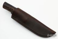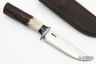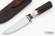 This Hunter by Mike Malosh features a satin finished convex ground blade with .172" blade stock and 1.136" blade depth, hidden tang construction. The handle has a stainless steel guard, stag grip with black, red and aluminum spacers. Comes with a brown leather sheath. New from maker at the 2022 Blade Show.